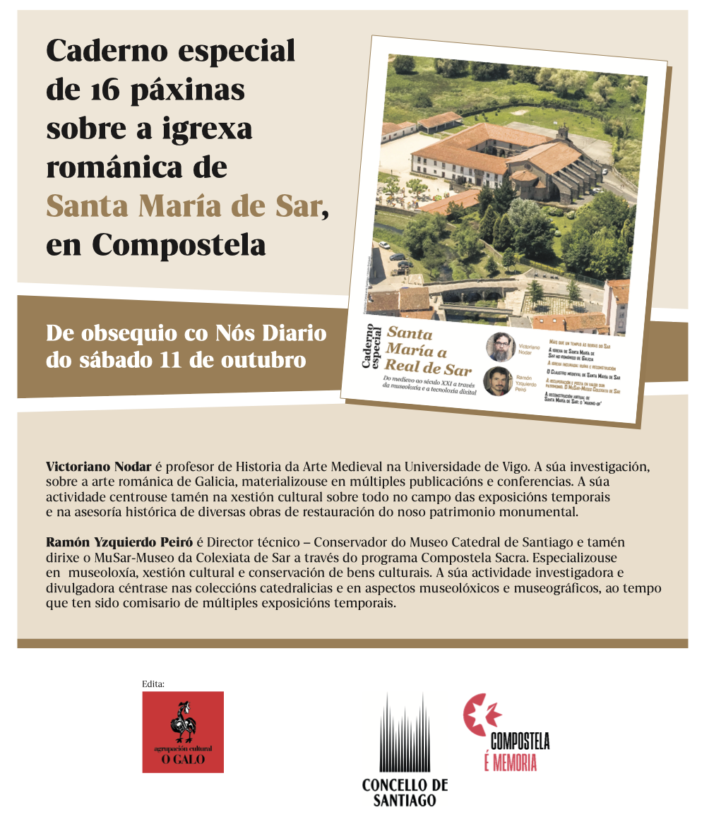 Santa María a Real de Sar. Do medievo ao século XXI a través da museoloxía e a tecnoloxía dixital é o título do caderno especial que se distribuirá de obsequio co exemplar do Nós Diario do sábado 11 de outubro, unha publicación editada pola Agrupación Cultural O Galo. Serán 16 páxinas elaboradas polo profesor de Historia da Arte Medieval na Universidade de Vigo Victoriano Nodar e polo director técnico-conservador do Museo Catedral de Santiago, Ramón Yzquierdo Peiró.